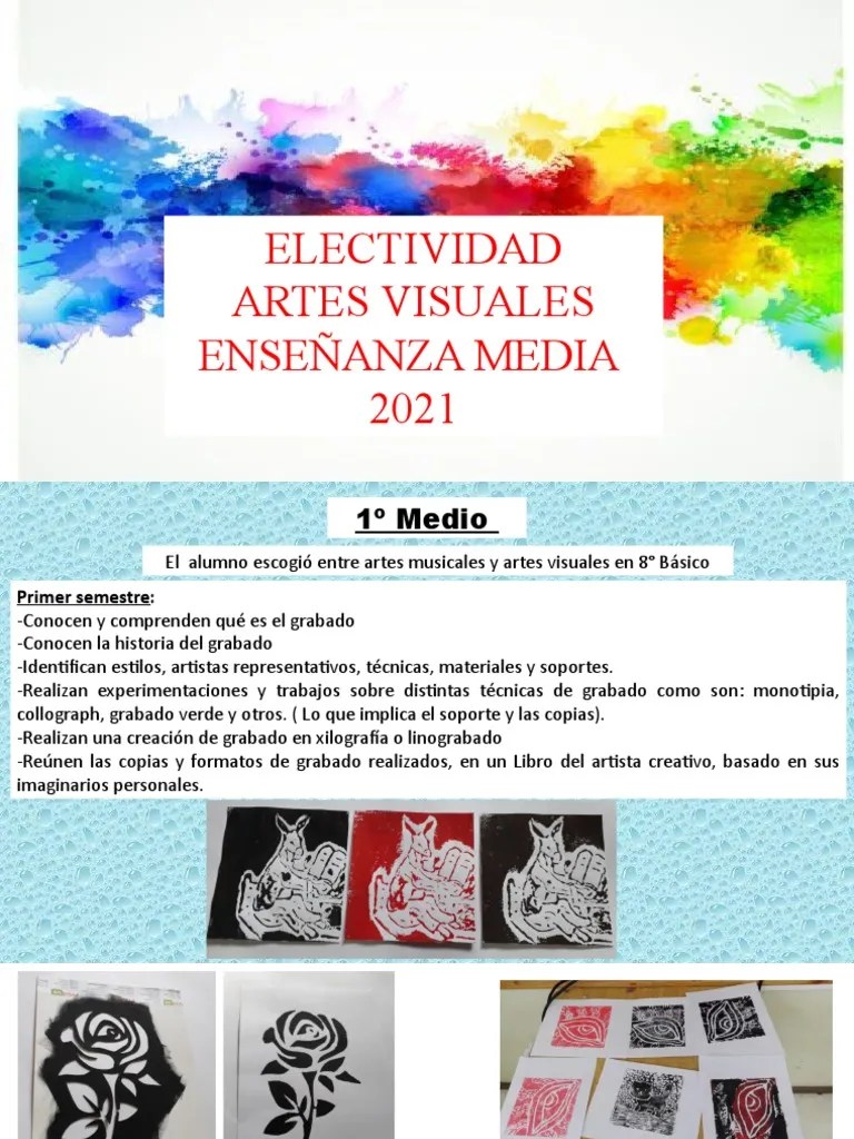 Habilidad para crear y modificar proyectos innovadores de artes visuales, audiovisuales y multimediales.. Página web del liceo : 28 de marzo de 2021, 18:52 módulo n° 1 en formato word. Ppt electivo 3° medio artes visuales.pptx. Pintura, dibujo, escultura, grabado, fotografia. Si es un archivo con un formato que no es imagen, se adjunta en el mismo correo, pero no en este ppt. En cambio, si es una imagen o varias imágenes,. Habilidad para crear y modificar proyectos innovadores de artes visuales, audiovisuales y multimediales. Equipo de desarrollo curricular unidad de currículum y evaluación ministerio de educación 2021 importante en el presente documento, se utilizan de manera inclusiva términos como "el docente", "el 28 de marzo de 2021, 18:52 módulo n° 1 en formato word.